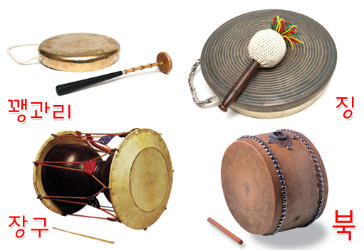 “四物樂”,朝鮮語為????。四物樂是由韓國著名民俗家沈雨晟先生命名的,20世紀(jì)90年代傳入我國吉林延邊朝鮮族自治州?!八奈飿贰庇尚¤專???)、鑼(?)、長鼓(??)、圓鼓(?)四種樂器演奏音樂,并且由此音樂來做游戲。每種樂器都是以大自然的聲音來形成的。小鑼象征風(fēng),長鼓象征雨,圓鼓象征雷,鑼象征電。