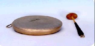 與小鑼相似但比小鑼要大,通常為面徑70CM,邊圈高10CM,邊穿小孔,用繩索固定。演奏時,左手提繩,右手拿錘演奏;盤坐演奏時大鑼懸掛在木架上,可以用手來控制音色,其聲音洪亮、粗獷。