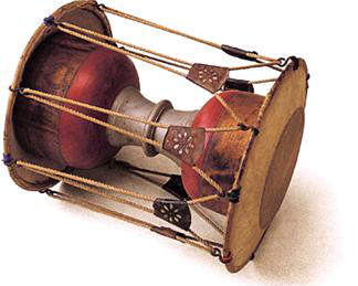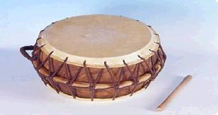 鼓框為木質(zhì),兩面蒙皮,用繩索固定在木框兩邊。鼓鏈木質(zhì),通常在表演中負(fù)責(zé)敲擊主要旋律的重拍,也有獨(dú)奏的情況,聲音有力。