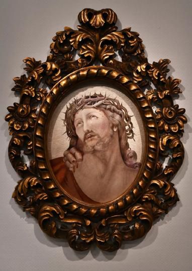 本作品展現(xiàn)的是耶穌被釘在十字架上遭受殘酷折磨的神態(tài)。作者用亂針繡和平繡相結(jié)合的方法,用細密的排針將耶穌的苦難放大在觀者面前。整個繡面呈現(xiàn)出了靜默而肅穆的氛圍。