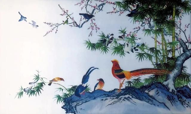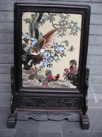 取材于古畫,采用蜀繡的運針、輔針、切針、沙針、滾針、打籽針等針法繡制。樹木花草層次分明、古樸自然,錦雞蝴蝶色彩艷麗。