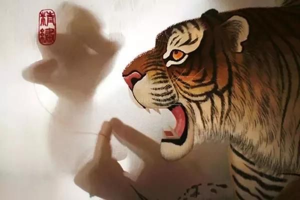 本幅繡品首次成功地將人物肖像圖方式引入傳統(tǒng)走獸刺繡之中。作者用細膩的針法細致精準地繡出了老虎根根可辨的絨毛和少女光滑細膩的皮膚,形成極大的反差,極具視覺沖擊力。