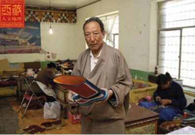 坐在工作臺(tái)上的赤列塔青,身材高大,穿一身合體的淺色藏裝,前擺上沾著幾星鼻煙,長(zhǎng)期用針的手指有些變形。翻開他的履歷發(fā)現(xiàn),赤列塔青可以說(shuō)是拉薩少有的制靴世家,他的父親邊巴頓珠在舊社會(huì)是個(gè)給人支差的貧苦鞋匠,靠給有錢人修鞋、做鞋為生。今年68歲的赤列塔青性格沉穩(wěn)、做事穩(wěn)健,他12歲當(dāng)學(xué)徒工,做鞋做了56年,如果再加上父輩的修鞋歷史,時(shí)間更長(zhǎng)。在今天的拉薩有這樣經(jīng)歷的人算是屈指可數(shù)了。赤列塔青從小就在父親和師傅身邊打下手,逐漸掌握這個(gè)足以養(yǎng)家糊口的一技之長(zhǎng),終于成長(zhǎng)為一個(gè)勤奮而多才的手工藝人,開始了穩(wěn)坐一隅的匠人生涯。