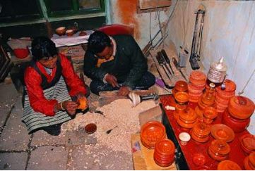 木碗的來源,一是西藏自己生產(chǎn)的,還有一種是云南迪慶生產(chǎn)的,都是從西藏的市場(chǎng)上交換或購(gòu)買的。西藏林芝地區(qū)的朗縣、察隅,山南地區(qū)的加查、隆子、錯(cuò)那,阿里地區(qū)的噶爾等地均產(chǎn)木碗。其中尤以錯(cuò)那生產(chǎn)的“察牙”木碗和噶爾生產(chǎn)的“堆旭”木碗最負(fù)盛名。以上木碗的原料選擇樹根或樹瘤車制而成,選料之講究,做工之精細(xì),使好木碗的花紋各異,或磷火紋,或豬鬃紋,或貓頭鷹眼紋,這些木碗都很名貴,與普通木碗之間的價(jià)格也很懸殊,一個(gè)上等木碗價(jià)值10頭牦牛,一般人家是不敢問津的,但也盡量想方設(shè)法弄個(gè)像樣的,以慰平生。