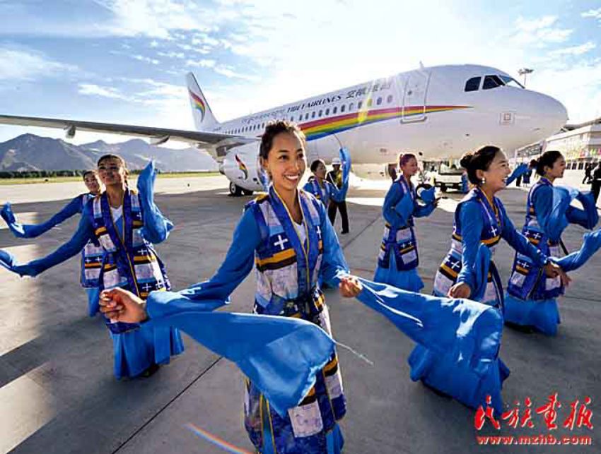 西藏已經(jīng)建成使用的機(jī)場有拉薩貢嘎國際機(jī)場、阿里昆莎機(jī)場、昌都邦達(dá)機(jī)場、日喀則和平機(jī)場和林芝米林機(jī)場。西藏還擁有自己的航空公司,圖為西藏航空有限公司成立暨首航儀式