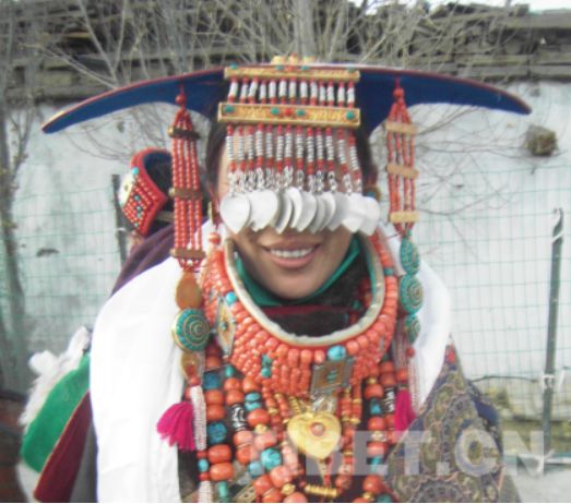 頭飾是普蘭飛天服飾的重要組成部分,一般由綠松石和珊瑚點(diǎn)綴,一個(gè)做成的飛天頭飾沒有幾萬元是買不下來的。當(dāng)然,那些鑲嵌其上的寶石決定了其價(jià)格的高低。普蘭市場(chǎng)中有一些尼泊爾商人專門制作那種頭飾,然后靜等當(dāng)?shù)厝罕妬磉x購。