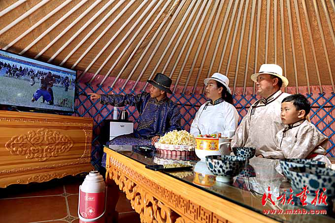 邊境牧區(qū)無線網(wǎng)絡暢通,阿巴嘎旗牧民伊拉勒圖一家在觀看直播節(jié)目。