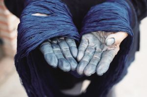 只見缸中漂浮著藍色蘑菇狀的泡沫,中間不規(guī)則的隙孔像是在呼吸。一旁的燦爛覺得好玩,找來一塊布條想放到染缸里,被拒絕了?!安荒苡门K的布,要保持清潔?!秉S奶奶正聲說。