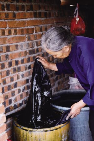 黃奶奶帶我去看她染布的地方,屋頂一間小小的屋子里擺了三個大缸,還沒走近就聞到濃烈的藍靛發(fā)酵所產(chǎn)生的獨特氣味。染缸用厚厚的布蓋著,如同黃奶奶的秘密寶箱,要掀開才能看到里面深色的液體。“今天不成,下次染布給你看?!彼戳丝匆后w表面,也沒多說,似乎染缸有它自己的節(jié)奏。