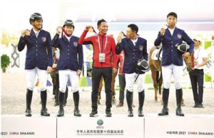 9月21日,西藏競(jìng)技馬術(shù)隊(duì)以總罰分106.5分位居第一,奪得第十四屆全運(yùn)會(huì)馬術(shù)三項(xiàng)賽團(tuán)體賽冠軍。