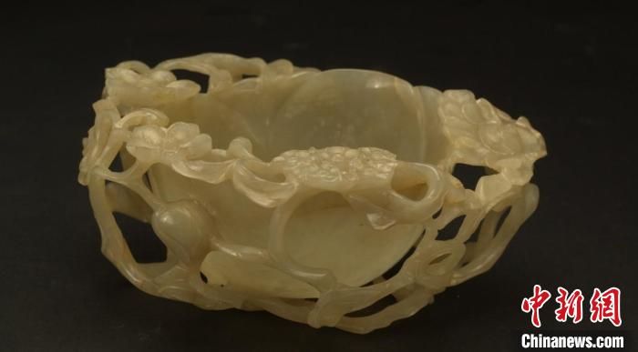 展覽展出的明代白玉透雕蓮花杯,以蓮花作器型,粗枝大葉和蓮花相襯托,造型別致,做工精美。