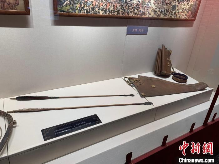 本次展覽將皇帝東巡期間所做的四項(xiàng)主要活動(dòng)內(nèi)容向觀眾做以介紹,它們是“習(xí)武展雄風(fēng)”“暢飲一家親”“祭陵敬先祖”“百禮在皇宮”。其中,“習(xí)武展雄風(fēng)”這部分展出了“清皇帝行圍鈚箭”“清嘉慶帝行圍櫜鞬”“清弘歷御用樺皮弓”“清射鹿鈚箭”等文物。據(jù)介紹,清帝東巡出山海關(guān)到東北地區(qū),所經(jīng)路途山林茂密,大型猛獸居多,正是實(shí)地演練的最佳時(shí)機(jī)。