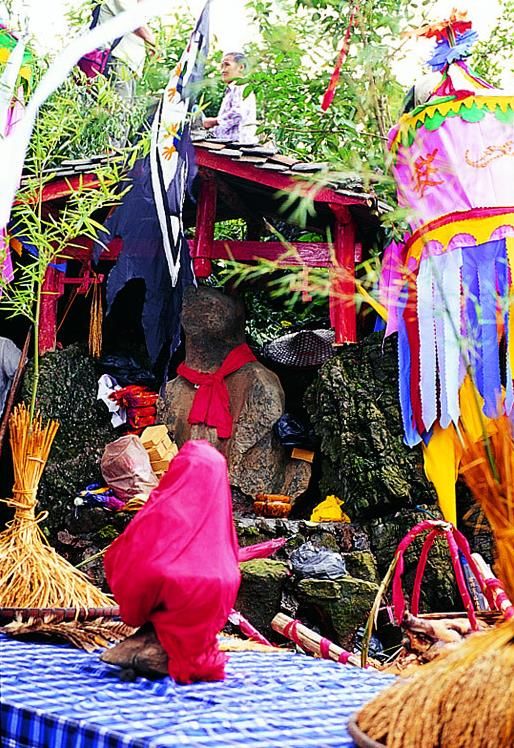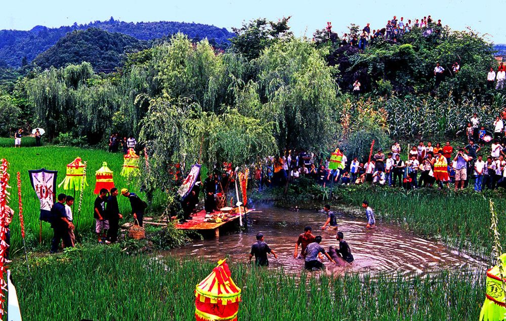 敬霞儀式在霞堂舉行。霞堂設(shè)有祭壇。壇前立著一根竹竿,竿頂上站立一只公雞。祭壇中是主祭席,其友有用松針?shù)伋墒€(gè)祭祀點(diǎn),由宗族各支系擺設(shè)祭品。敬霞這天,各支系由德高望眾者領(lǐng)隊(duì)。抬著豬肉、糯米飯、米酒等食品列隊(duì)進(jìn)入霞堂。一路上銅鼓、銅鑼、欽、革鼓被敲得冬嚏冬嚓地響,人們跟在后面吆喝著前進(jìn)。祭典開(kāi)始,鑼鼓暄天。接著由執(zhí)壇的水書先生念讀敬霞的祝詞,內(nèi)容多為祈福禳災(zāi),期冀風(fēng)調(diào)雨順,人壽年豐之類。祝詞之后便酪酒祭之:此后,由兩個(gè)身穿白衣的小伙子抬一母豬到田壩中繞行,后面那位不時(shí)用松針刺戳豬的尾部,使它發(fā)出嗥叫聲。圍觀的人常常發(fā)出哄笑,并且盡情地用竹片屏水和撮稀泥向抬豬者灑淋過(guò)去。走過(guò)霞堂之后,抬豬者丟下母豬,故意穿進(jìn)圍觀的人群,嚇得人們四處躲避。這種逗趣結(jié)束之后,水書先生再度念讀咒詞,當(dāng)他手中的執(zhí)法彩杖一揮時(shí),飼雞者便學(xué)雞嗚,逗引竹竿頂上的公雞啼鳴。這時(shí),主祭者就向眾人高呼:等待霞神降雨來(lái)沐浴。此后,水書先生再念祝詞,又酹酒祭之。然后由各族系代表抬著"酒壇去澆灌"霞神"。人們用酒從頭澆到腳,一直澆到"霞神"們倒(象征酒醉)才算祭祀的成功。