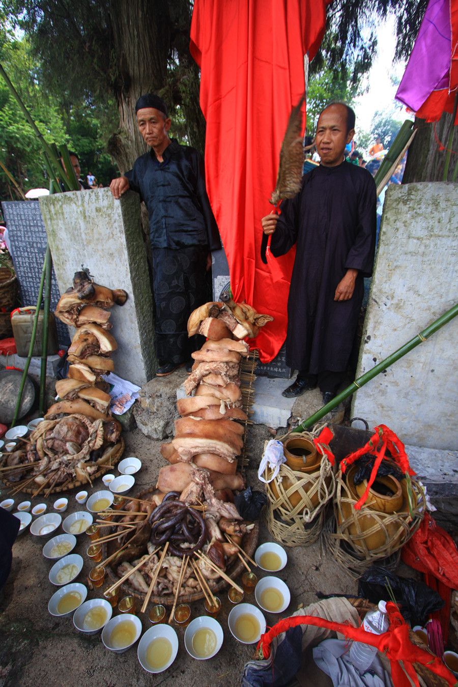 人們傳說(shuō)只有醉倒了"霞神",它才能永遠(yuǎn)留在這方,才能使這里風(fēng)調(diào)雨順。當(dāng)水書先生念了最后的咒詞,祭典才在鼓樂(lè)聲和歡呼聲中結(jié)束。最后,各族系將祭肉一并聚攏,聚餐慶祝。天黑之后,人們秘密地將"霞神"收藏起來(lái),至此,"敬霞"活動(dòng)全部結(jié)束。