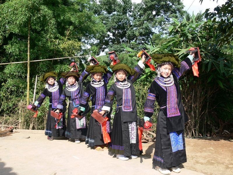 板凳舞,苗語稱:“卡牛檔”。關(guān)于它的起源,在黑苗中一直這樣流傳:相傳在很久以前,寨中的男子都參軍打仗去了,剩下老人、婦女和小孩,由于地處高山,深林密布,經(jīng)常有野獸出沒,婦女們?yōu)榱藟涯?,白天晚上都喜歡聚在一起,用小板凳互相擊打,敲出聲響,驅(qū)趕野獸……漸漸地,就慢慢演變成了在當(dāng)?shù)孛缱鍕D女生小孩辦滿月時(shí),拿小板凳敲擊舞蹈祝福小孩的習(xí)俗。