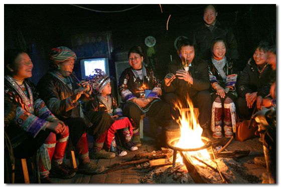 苗族起木樓很注重火塘的設(shè)置,特別留出二樓正中的大半廂作火塘?;鹛劣脤捄窭仙寄景彖傊瞥梢粋€長寬約一點五米,深約六十公分的正方形木槽,槽內(nèi)用粘性強的黃泥巴填滿舂緊,正中央安放有三腳鐵架,用于架鍋煮食。火塘是煮吃、進餐、取暖、會客、議事、祭祀的地方,又是年輕人走妹行歌、談情說愛、舉行婚禮儀式的場所。因此苗家人對火塘是十分看重的。