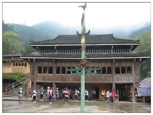 蘆笙坪面積約有一個籃球場大小,四周都是吊腳木樓。坪中央豎立一根雕刻有錦雞、水牛角、龍等圖騰物的蘆笙柱。有的蘆笙坪還專門用卵石圍繞蘆笙柱排列鑲砌成各種圖案。蘆笙坪是經(jīng)過眾議開辟留下的,任何人不得侵犯和占用,也不能堆放雜物,是全寨的公共財產(chǎn)。