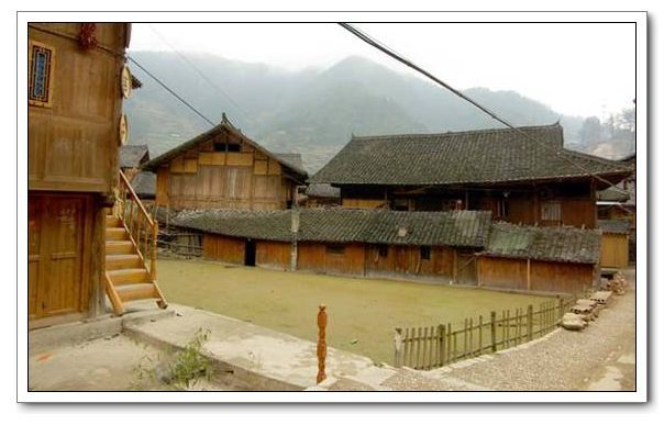 苗族山寨,村民居住的是吊腳樓。苗族大多居住在高寒山區(qū),山高坡陡,平整、開挖地基極不容易,加上天氣陰雨多變,潮濕多霧,磚屋底層地氣很重,不宜作息起居。因而,苗族山寨歷來依山抱水,能工巧匠用本地盛產(chǎn)的杉木,構(gòu)筑一種通風性能好的干爽的木樓,叫“吊腳樓”。苗族的吊腳樓建在斜坡上,把地削成一個“廠”字形的土臺,土臺下用長木柱支撐,按土臺高度取其一段裝上穿枋和橫梁,與土臺平行。吊腳樓低的七、八米,高者十三、四米,占地八、九十個平方米。屋頂除少數(shù)用杉木皮蓋之外,大多蓋青瓦,平順嚴密,大方整齊。吊腳樓一般以四排三至五間為一幢,有的除了正房外,外延還搭了一兩個“偏廈”。每排木柱一般9根,即五柱四瓜。每幢木樓,一般分三層,上層儲谷,中層住人,下層樓腳圍欄成圈,作堆放雜物或關養(yǎng)牲畜等。住人的一層,旁有木梯與樓上層和下層相接,該層設有走廊通道,約1米寬。堂屋是迎客間,兩側(cè)各間則隔為二三小間為臥室或廚房。房間寬敞明亮,門窗左右對稱。有的苗家還在側(cè)間設有火坑,冬天就在這燒火取暖。中堂前有大門,門是兩扇,兩邊各有一窗。中堂的前檐下,都裝有靠背欄桿,俗稱“美人靠”。大多數(shù)吊腳樓在二樓地基外架上懸空的走廊,作為進大門的通道。堂屋外的懸空走廊,安裝有獨特的s形曲欄靠椅,苗語叫“嘎息”(ghabxil),民間有一美稱叫“美人靠”,這是因為姑娘們常在此紡紗織布、挑花刺繡,向外展示風姿而得名。其實“嘎息”還用作一家人勞累過后休閑小憩、納涼觀景、講述傳承苗族神話和遷徙歷史,以及演唱《苗族古歌》、“嘎百福歌”的多功能涼臺。外設長廊、置板凳,便于夏夜乘涼、唱歌、閑聊。中廳設有火塘,置三腳灶,上部吊禾坑,烘烤谷物或其他食物。火塘兩頭隔開作內(nèi)房,供住宿。