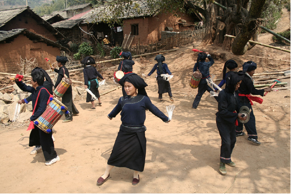 蜂桶鼓舞是布朗族的群眾性舞蹈,分為三步和五步兩種。演出時,由兩名年輕男女雙手各持一條“帕節(jié)”(即毛巾)在前面跳“帕節(jié)舞”引導(dǎo),舞蹈動作主要是甩手巾。其后是蜂桶鼓隊(duì),一般為4—6只,后緊隨2只象腳鼓,之后是6人敲打的大、中、小芒和镲,最后是跟著跳舞的人們和助興的老幼。蜂桶鼓舞的節(jié)奏明快熱烈,幾種打擊樂器相配合,“嘣咚、嘣咚……嘭嚓、嘭嚓……鏘切、鏘切……”,高、中、低音融為一體,獨(dú)具情趣。動作大方、瀟灑、粗獷、活潑;舞姿輕盈、柔和、細(xì)膩。大南直布朗蜂桶鼓隊(duì)多次被邀赴省城和省外演出,向人們展示了本民族獨(dú)特的文化藝術(shù)風(fēng)采。