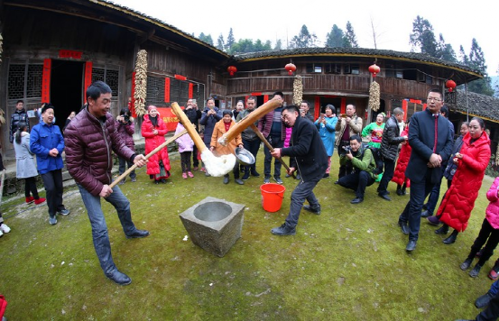 更具特色的要數(shù)正月十五趕毛狗子了。傳說毛狗子(狐貍的俗稱)喜歡偷雞吃,所以必須得趕走。趕毛狗這一天,親朋好友聚在一起,先用竹筒做成火把或用木梓油做成燈備用,再砍樹枝搭成棚子,放入草扎的毛狗子,堆放未破節(jié)的竹筒和火炮樹葉。待天黑,男女老少全部出動,在屋邊及路邊插上點燃的火把、燈,然后燒燃毛狗棚,這邊的人群發(fā)出“哦嗬”聲,那邊的人群高喊“趕毛狗子喲!”此時,滿山遍野火光沖天,叫喊聲此起彼伏,震耳欲聾,熱鬧非凡。