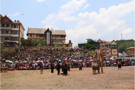 剽牛是佤族祈求神靈保佑,人們安居樂業(yè)、吉祥如意、幸福安康的一種傳統(tǒng)祭祀活動,同時他們也認為這是與神靈鬼魂溝通的最有效方式?!柏狻弊殖浞煮w現(xiàn)了剽悍、敏捷而勇猛的含義?,F(xiàn)在剽牛樁上已經(jīng)拴好了要舉行剽牛祭祀的水牛,各鄉(xiāng)鎮(zhèn)群眾已經(jīng)陸續(xù)就位,讓我們一起去領略佤族狂野的剽牛祭祀吧!