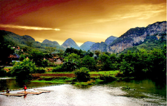 壩美,為壯語譯漢語為:壩—沖口,美—樹 ,因居住的沖口樹木多而得名。壩美村位于珠江流域西江水系馱娘江上游的阿科河畔。屬喀斯特地貌,區(qū)域內(nèi)山峰奇特,河谷幽美,阡陌縱橫,河流山泉蜿蜒奔流,溶洞層疊散布在山體峰內(nèi),冬無嚴(yán)寒,夏不酷暑,氣候宜人。因四面環(huán)山,不通公路,進(jìn)出寨子主要靠村前村后兩個天然的石灰溶巖水洞,村民們要摸著巖壁趟水、撐竹筏、劃獨木舟、坐小船,經(jīng)過950米長的幽暗的“出水洞”和680米長的“湯拿洞”才能進(jìn)出。由于地處偏僻,交通不便,基本不與外界交往,多年來壩美村長時期與外世隔絕。壩美村水源豐富,氣候溫和,自然生態(tài)環(huán)境未被污染,負(fù)氧離子質(zhì)數(shù)高出城市數(shù)倍,游人在此休憩,心曠神怡,是一個溫濕潤,四季宜人的旅游勝地。就生態(tài)環(huán)境和歷史淵源來說,《桃花源記》問世1500多年,只聞其名,不見其實。相傳除唐代確認(rèn)湖南省桃源縣的桃源洞為其原型外,目前全國就有冠名“世外桃源”的地名16個之多。而今天的壩美,不僅十分相似,而且還神似東晉文學(xué)家陶淵明筆下所描寫的“林盡水源,便得一山。山有小口,仿佛若有光;便舍船從口入……土地平曠,屋舍儼然,有良田美池桑竹之屬;阡陌交通,雞犬相聞……”的世外桃源。而且在當(dāng)?shù)卮迕裰杏性S多歷史傳說:北宋皇祐四年(公元1052年),壯族起義領(lǐng)袖儂智高在邕州(南寧)昆侖關(guān)被狄青打敗后,退入以其繼父儂夏卿為首領(lǐng)的特磨道(廣南)后,至和二年(1055年),宋朝廷又派楊文廣領(lǐng)兵進(jìn)剿,儂智高在突出重圍轉(zhuǎn)至阿科(今廣南縣壩美鎮(zhèn)治所)與宋軍周旋,終因寡不敵眾而離開阿科轉(zhuǎn)戰(zhàn)于丘北、開遠(yuǎn)、蒙自、元江等地,后到大理不知所終。