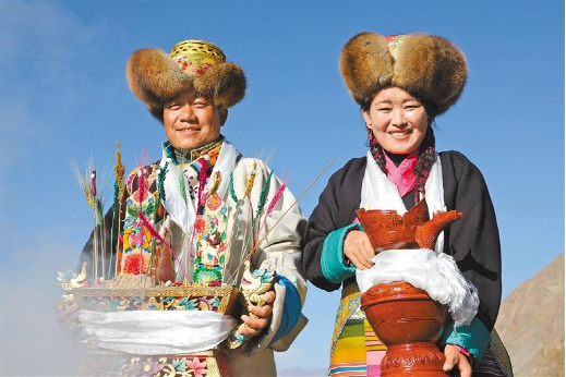曲水縣協(xié)榮村春耕儀式上,身著盛裝的村民端著切瑪和青稞酒。