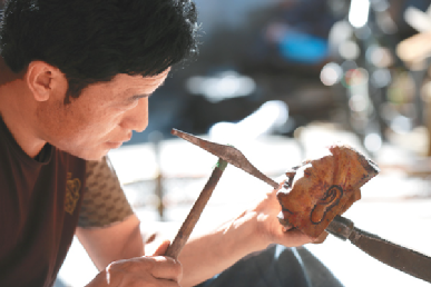 20歲前的次嘎已可以承接一些佛像的鍛敲任務(wù),掌握的技術(shù)遠遠超出一起學(xué)習(xí)的其他學(xué)徒們。從鍛敲佛像的蓮花底座、焊接,再到鍛敲銅佛造像上半身、下半身,再到慢慢地開始做些佛像飾物。偶爾,次嘎也能涉獵造像的臉部。這是一個造像師手藝達到最好時才可以觸及的部位?!懊娌拷Y(jié)構(gòu)復(fù)雜又微妙,面部表情的刻畫更是難上加難。作為一個造像師,這是最考驗功力的地方,每一次敲打都在決定作品的成敗?!贝胃抡f道。