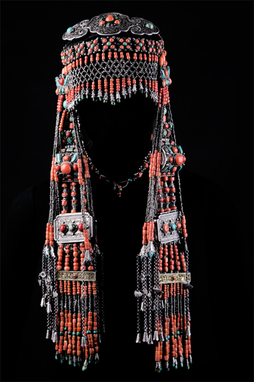頭箍飾:是整個頭箍是頭飾的中心骨架,也是頭飾的中心飾件,飾于頭圍,呈圓扁形環(huán)狀飾帶, 多以青色綢緞布打成袼褙后剪制成底襯, 與頭圍周長相吻合。在其表面以綢面貼飾,再依個人愛好在頭箍外緣表面上, 釘綴銀托。銀托可分三種:其一為圓形鏨花掐絲云紋銀托,其銀鏨花中間為圓形環(huán)飾, 間鑲嵌呈半圓體形紅色珊瑚珠,由白色銀鏨托飾托起, 釘綴在青色綢箍之上, 青、白、紅相映, 艷麗無比;其二在銀鏨托花飾正中,有一個較大的銀鏨托花正好飾在額前雙眉之上,呈桃形銀鏨托花,上鑲嵌半圓體形珊瑚珠,并在珊瑚珠周圍鑲嵌葉片形綠松石珠,從整體造型來看似一串水晶般紅綠葡萄在額前閃耀, 十分華麗;其三在前額頭箍處, 于半圓形浮雕式的銀鏨花托間隔金剛杵形銀托座, 在托坐之上鑲嵌長圓柱形的珊瑚珠, 美觀莊嚴, 具有宗教含義。