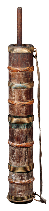 酥油茶是藏族最普遍的飲料。一日三餐、接人待客,都離不開酥油茶。酥油茶的制作各地不盡相同,西藏人打酥油茶時,先將磚茶熬成茶水濾掉茶葉,在特制的酥油桶內(nèi)放適量的酥油、鹽和開水,再將茶水倒入酥油桶內(nèi),然后用特制的木棒上下攪拌,直到茶水和酥油完全相溶即可。而甘青一帶藏族是先將茶盛在碗里,然后加酥油,喝時一邊吹碗邊的油,一邊喝,添數(shù)次茶水后,酥油也喝完了(圖為打酥油茶桶)。