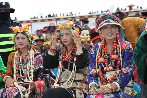 甘、青、川的藏族男子非常講究腰飾,有財(cái)力的男子一般都有一條鑲有僅、銀、玉的寬皮腰帶,腰帶上還掛有裝飾性的小刀、火鐮等。青海玉樹地區(qū)的婦女裝追求華麗,內(nèi)衣外袍色彩艷麗,綢緞腰帶留長(zhǎng)飄帶,頭、頸、發(fā)、腕、指和腰佩有金、銀、玉、珊瑚、瑪瑙等珍貴飾品,一套豪華女裝價(jià)格不菲。因此有諺語(yǔ):“男人的財(cái)富系在腰上,女人的嫁妝穿在身上”之說(shuō)。云南藏區(qū)的女裝上身穿長(zhǎng)袖彩綢衫,外著無(wú)袖大襟長(zhǎng)袍,長(zhǎng)袍領(lǐng)口、襟邊和下擺鑲有錦緞,色彩艷麗。云南一些藏區(qū)的女子喜歡穿百褶裙,顯示出女性的優(yōu)美身材。西藏工布地區(qū)的女裝顯得簡(jiǎn)約,先穿有袖內(nèi)衣,再將氆氌拚縫成大片,中間挖一圓口,穿時(shí)將頭伸進(jìn)圓口兩端垂與胸背,再束腰帶即可。藏族婦女的頭飾也很多,有碎辮的、有戴頭巾的,有盤發(fā)的,西藏山南地區(qū)的巴珠最有特點(diǎn)。巴珠是三枝狀,平系于頭頂兩枝向前,將分梳的兩條發(fā)辮分別盤于兩枝上。其上部還有一弓形物,與三枝狀兩端連接,上系絲織品,邊緣鑲珍珠、珊瑚等。女子13歲戴巴珠,象征已經(jīng)成人。金邊帽也很有特色,藏區(qū)的男女都戴。帽型為桶狀,周邊鑲織錦,內(nèi)有四片耳片,兩大兩小,天冷時(shí)放下耳片護(hù)耳。狐皮帽形似倒掛的金鐘花,以布作底層,再縫上狐貍皮,帽后有兩條長(zhǎng)飄帶。男帽稍高,女帽較低。