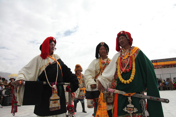 藏族分布在全國(guó)五省區(qū),因氣候、環(huán)境的不同,形成了豐富多彩的服飾文化。藏族服飾有“隔山兩個(gè)樣的”說(shuō)法,有人統(tǒng)計(jì),因地域、男女、年齡、婚否和季節(jié)的不同,藏族服飾有100多種。男裝各地大同小異,上身穿寬大的藏袍,袖長(zhǎng)及膝。束各種腰帶。寬大的藏袍非常適應(yīng)青藏高原多變的氣候,露出右臂便于勞作,天熱時(shí)將脫掉兩袖,將藏袍扎在腰間,天冷時(shí)套上雙袖。西藏人的服飾樣式很多,有衛(wèi)藏類服飾、康巴類服飾、安多類服飾和拉薩裝。衛(wèi)藏主要指除昌都地區(qū)以外的西藏大部分地區(qū)。西藏大部分地區(qū)的男裝,主要衣料是氆氌,城鎮(zhèn)人多穿黑色,農(nóng)牧民多穿白色??蛋椭饕肝鞑氐牟己颓嗪5挠駱?、果洛一帶。男子多內(nèi)穿右襟齊臍短襖,外罩圓領(lǐng)寬袖長(zhǎng)袍。頭戴狐皮帽或“扎秀”(發(fā)辮纏紅絲線),扎腳穿高筒靴顯得英俊瀟灑。女子穿長(zhǎng)袖衫,外罩坎肩,腰束彩條圍裙。講究腰帶和腰刀,腰帶和腰刀上要鑲嵌金銀珠寶。女子多戴名貴飾品,顯得華麗昂貴。安多藏區(qū)主要指西藏那曲與安多縣接壤的地方。過(guò)去,男裝衣領(lǐng)、袖口,下擺多飾虎豹皮,女裝邊飾多為水獺皮,而且項(xiàng)、腕、手指和腰間配有金銀寶石飾物。