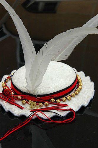 在被俘的人中,送信人戎魯也被捆綁著,關(guān)在一間灶房里,還有人看守著。但在半夜里,戎魯慢慢掙脫了綁索,殺死了看守。天很黑,他聽見雞叫了,便在雞身上扯了一些毛,從灶前拿了一些柴,把雞毛作為點火的引線,點燃了柴禾照明,連夜趕回山里報信。后來為了紀念被殺害的頭領(lǐng)和這位報信人,就在白氈帽上插白雞毛。男的插一只直的,表示心要直,人品要好。女的可以插幾只,表示美麗。人人都要隨時戴上,因為這是白馬藏人民族的光榮標志。
