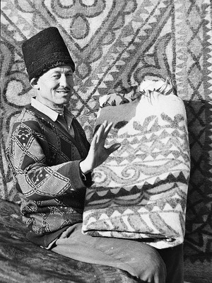 這時(shí),亞生已經(jīng)開始了第二步,他把彈好的羊毛鋪勻,開始噴灑開水。只見他熟練地把水噴向羊毛,然后和妻子一起快速把簾子卷好,用羊毛繩綁緊,再用腳踏著卷好的簾子在平地上來回踏蹬,這樣不停地重復(fù)后,做成了氈坯。亞生停下來解開簾子,拉平氈坯,修整好邊角,又灑上熱開水,把氈坯卷起,這是工藝最關(guān)鍵也是最后一步——他們一起跪在簾上,用雙臂反復(fù)搓滾氈坯,感覺已經(jīng)平整了,夫婦倆又齊心協(xié)力把氈坯展開拉平,放到院子里。此時(shí),亞生長(zhǎng)出了一口氣,抹抹頭上的汗說:“晾干了就可以賣了!”
