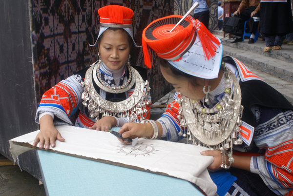 刺繡是苗族源遠(yuǎn)流長(zhǎng)的手工藝術(shù),是苗族服飾主要的裝飾手段,是苗族女性文化的代表。貴州省居住著大量的苗族同胞,他們創(chuàng)造了不同樣式、風(fēng)格的服飾。他們的服飾有便裝與盛裝之分,平日著便裝,節(jié)目或姑娘出嫁時(shí)著盛裝,無論服裝還是頭飾,工藝復(fù)雜,做工精細(xì)。
