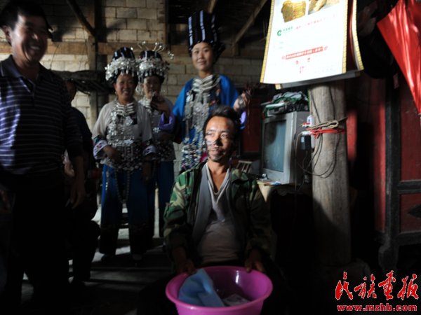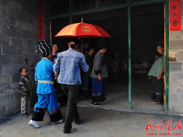 姑娘出嫁必須有娘家人陪送,婚禮這一天清早,“新娘”便在“接親客”的帶領(lǐng)和送親隊(duì)伍的陪同下,一路歡聲笑語(yǔ) ,浩浩蕩蕩向“新郎”家走來(lái)。走到新郎家村邊,有的燃放鞭炮,一直燃放到新郎家門口,請(qǐng)新郎父母出來(lái)開門;無(wú)鞭炮準(zhǔn)備的,則在寨邊稍候,由迎親伙伴飛報(bào)新郎家做好迎親的準(zhǔn)備。男方父母聽到后,多數(shù)是很高興地喊醒家中兒女,由新郎的妹妹或堂姐妹為迎親主體,加上寨上的姐妹和房族組成迎親隊(duì)伍,打開大門,把新娘迎進(jìn)家來(lái)。接親的主要儀式是接傘。接傘的人必須是新郎的小妹或堂妹。無(wú)親妹、堂妹者則由新郎父母指定一與新郎同輩份的小姑娘去接。新娘走至大門,即由新郎的妹妹跨出門外迎接新嫂子,新嫂子接著用左手把雨傘遞給接傘的妹妹,接傘妹妹接過(guò)新嫂子手中的雨傘后,新娘即用左腳跨進(jìn)屋內(nèi),以示今后成為新家庭的主婦。隨即由接傘妹妹攜新娘手迎入新房,迎親婦女們陸續(xù)進(jìn)入新房休息。入門后,新郎家的“陪娘”及姑娘們便熱情地安排“送親客”團(tuán)團(tuán)圍坐,并簇?fù)碇靶履铩本o靠堂屋中柱子就坐,意為“新娘”從此當(dāng)家立業(yè),將來(lái)就像中柱子一樣,頂大梁,撐起這個(gè)家。