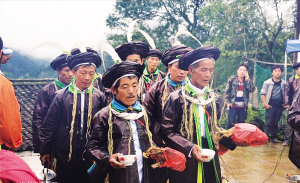 據介紹,舉辦牯藏節(jié)是為了給苗族人家?guī)硇腋?。牯藏?jié)第一天,牯藏頭(由村里5位精干的已婚男子組成)在村中挑選連同自己在內的12名德高望重的長老,組成一支祭祀隊伍,安排祭祖。他們用新砍伐的木竹編織成坐榻,讓6個年輕人坐于其上,30余人抬著他們,前面長老開道,吹起祭祖蘆笙,跳起祭祖舞,抬著祭祖飯,向祭祖堂緩緩走去,進行殺牛豬、祭奠等。