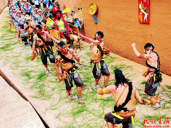 恭請大啞巴的儀式上,羅支全部到齊。羅支就是眾老啞巴,為首的被稱為畢摩。彩繪時,以不同的圖案分別繪在臉部的右上方作為家族和輩分區(qū)別。儀式上,六位畢摩在護衛(wèi)總管的護衛(wèi)下,依次點香叩首。畢摩大聲喊“請啞巴出山嘍”。然后四個壯實的中啞巴用扎好的彩轎抬著大啞巴游街,其余啞巴打歌跟在后面。最為活躍的是畢摩的跟幫,也稱為“馬彷”,他們以倒退的方式,邊跳邊引導(dǎo)行進的隊伍。啞巴隊從村頭到村尾,通過祭拜龍樹、祭鼓,經(jīng)過“三請三唱三起號”,將大啞巴請到廣場,隨后開始了具有濃厚文化底蘊的啞巴舞表演。