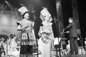 廣西戲劇院成立一年來,承擔(dān)起壯劇、桂劇、彩調(diào)劇3個國家級非物質(zhì)文化遺產(chǎn)劇目和京劇國粹藝術(shù)的傳承、保護、發(fā)展重任,不斷推出具有“美麗廣西、壯鄉(xiāng)風(fēng)格、時代特征、和諧兼容”的舞臺藝術(shù)精品,此次推出的《壯族詩情》便是其中之一?!秹炎逶娗椤饭卜帧暗毓摹薄ⅰ疤旄琛?、“水秀”、“山雄”4個章節(jié),以150多名演職員的演出陣容,通過合唱、獨唱以及民族器樂演奏的形式,如詩如畫地描述了廣西壯族的風(fēng)土人情,突出了“美麗廣西”時代主旋律。圖為《壯族詩情》演出現(xiàn)場。