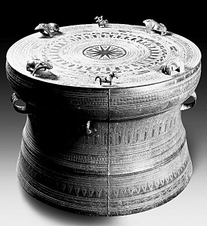此銅鼓出土于廣西藤縣,為壯族先民所鑄。銅鼓呈圓墩形,造型接近黃金分割比例,花紋密集精美。鼓面上的太陽...