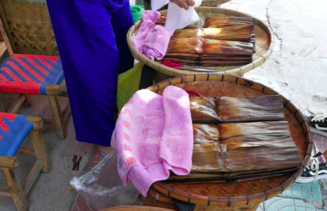 褡褳粑是布依族人民喜愛的傳統(tǒng)食品,因其如褡褳袋而得名。每逢農(nóng)歷七月十五日(中元節(jié)),布衣族人民均普遍制作褡褳粑,作為祭祀祖先的供品。相傳兩千多年前,祭祖是用當?shù)厥a(chǎn)的芭蕉果和普通糍粑,后來發(fā)展為用芭蕉和糯米蒸熟,加上紅糖,制成甜味糍粑。又經(jīng)過多次改進才形成現(xiàn)在的褡褳粑。如今,除七月十五日以外,逢年過節(jié),宴客,走親訪友,也要制作褡褳粑。蒸熟后的褡褳粑呈長方形,色澤醬黃,香甜細膩,具有芭蕉果和芭蕉葉的特殊香味。熱吃軟滑細膩,冷吃清涼甜潤,烙食香脆。
