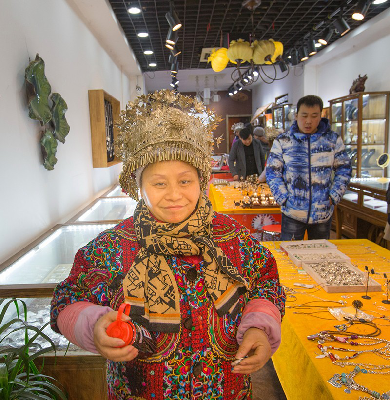 楊玉芬初到西安,是2008年來參加西部洽談會。那一次,她的苗族銀飾一天里賣了幾萬元,讓她十分驚喜。洽談會一結(jié)束,她一出來就直接打的,上去就問司機(jī)你們西安哪里最熱鬧???司機(jī)說當(dāng)然是回民街啦!她便讓司機(jī)帶著直奔回民街,下了車,就地找了個攤位就擺起貨來。沒想到兩個小時就賣了3000多元。在西安生意這么好做??!楊玉芬當(dāng)即決定不走了,鐵下心留在回民街。當(dāng)初,在滿是小吃的回民街上突然出現(xiàn)這么一個穿著苗服的女子忙來忙去賣銀飾,的確顯得很扎眼。但楊玉芬不把自己當(dāng)外人,很快融入了回民街,生意如同芝麻開花節(jié)節(jié)高,賣的品種越來越多,掙的錢也越來越多。她的攤位從小到大,從街邊升到室內(nèi)。去年,楊玉芬干脆在離回民街入口很近的黃金地段租了一間幾十平米的大店鋪,徹底結(jié)束“練攤”的日子,名正言順開起了“苗奶奶”銀飾店。有著上千種精美銀飾的“苗奶奶”,今天已成為坊上的一道風(fēng)景。