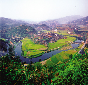 侗家人聚族而居,多是一姓一寨,或幾戶同寨,但分片而居。村寨多建于有河流的山腳下,榕樹(shù)參天、群山環(huán)抱、流水潺潺,寨邊風(fēng)雨橋橫跨村頭寨腳的溪流之上。寨內(nèi)鼓樓聳立,干欄式木樓廊檐相接,鱗次櫛比,加上侗族人擅長(zhǎng)用水車提水種植水稻,登高望去,真是一派山明水秀的田園景象。