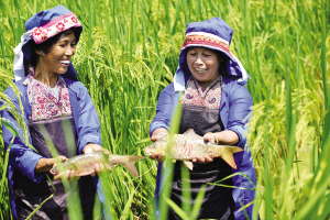稻田養(yǎng)魚是當?shù)囟编l(xiāng)群眾的傳統(tǒng)習俗,燒魚是侗族的一種傳統(tǒng)美食。“燒魚節(jié)”是當?shù)囟弊宓囊豁梻鹘y(tǒng)民俗活動。在初秋時節(jié),當?shù)囟弊迦罕婇_田放水,捉魚,全寨男女老少,野外生起篝火烤魚,用燒魚、米酒等祭祀魚神,祈禱魚糧豐收。圖為該寨的侗族群眾在稻田捕魚。