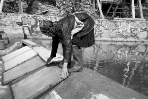 占里村共有182戶827人,這里的侗族古法造紙術(shù)源遠(yuǎn)流長(zhǎng),全村從事造紙業(yè)的就有170戶,占總戶數(shù)的93%。這里的造紙業(yè)依然保留著原始的家庭作坊和世代傳承的手工制作方式。這種古法造紙技藝以構(gòu)樹(shù)皮為原材料,添加獼猴桃藤、野棉花根,經(jīng)過(guò)水浸泡、石灰腌制、蒸煮、碓爛、攤曬、燒堿漂白、打漿、瀝水、抄紙、烤干等72道工序,最終制成白皮紙。