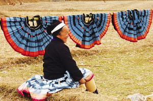 白褲瑤女人體態(tài)婀娜。這婀娜既來自于她們風(fēng)擺楊柳般的百褶裙,也來自身上前后兩片的夏衣。夏衣,黑色的調(diào)子,沒領(lǐng),沒袖,前面是一塊和肩膀?qū)挾认嗟鹊恼叫嗡夭?,后面則是用蠶絲布來制作的裙邊土布,上面繪滿了蠟染和花繡圖案。用漿染土布縫制成的百褶裙上,布滿了手繪而成的彩色圖案。其最復(fù)雜的工序,一是借粘膏樹汁憑空勾畫,二是用花線依著粘膏樹汁描過的隱約印痕,一點(diǎn)一點(diǎn)地挑繡出彩色圖紋來。做好一條裙子,往往需要花上女人們半年的時間。