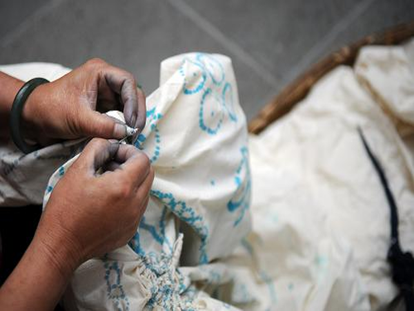 扎染布料為純白布或棉麻混紡白布。工藝過程分設(shè)計、上稿、扎縫、浸染、拆線、漂洗、整檢等工序。制作時,根據(jù)人們喜歡的花樣紋式,用線將白布縛著,做成一定襞折的小紋,再浸入染缸里浸染。染色時,將白布上畫好花紋的部分用針線縫起來,外觀上看,像一個個的疙瘩,入染缸中浸染,扎起的疙瘩不會著色,展開后即形成花紋。由于花紋的邊界受到染液的浸潤,圖案產(chǎn)生自然暈紋,青里帶翠,凝重素雅,薄如煙霧,輕芳蟬翅,若隱若現(xiàn)。