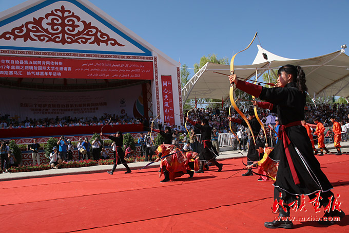 射箭是游牧民族在過去的游牧生活中必會的生存本領(lǐng)之一,哈薩克族的射箭也是傳統(tǒng)的體育競技項目。圖為阿克塞之鷹2017年絲綢之路騎射國際大學(xué)生邀請賽上,學(xué)生的射箭展示