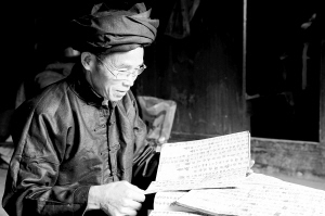 貴州省榕江縣水尾水族鄉(xiāng)水盆村地處月亮山深處,與外界接觸少。目前,該村村民仍穿水族服裝,講水族語言。該村有169戶共796人,水書先生有10人。他們保存水書1000余冊,其中, 有成書50年以上的水書300余冊。圖為水書先生王明先在向人們展示水書。