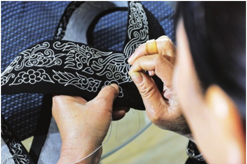 第四步是刺繡,包括三個(gè)環(huán)節(jié),即固定框架圖案、填芯和鑲邊。固定框架圖案,即用一根大針將馬尾線(xiàn)穿好,再用另一根稍小的針穿上同色絲線(xiàn),然后一邊用馬尾線(xiàn)在布面上鑲成各種圖案,一邊用穿有絲線(xiàn)的小針將圖案固定在布面上。填芯,即用各色絲線(xiàn)將固定好的圖案空隙部分填滿(mǎn)。鑲邊,即用橙色和黑綠色絲線(xiàn)在四周挑繡成鑲邊圖案。